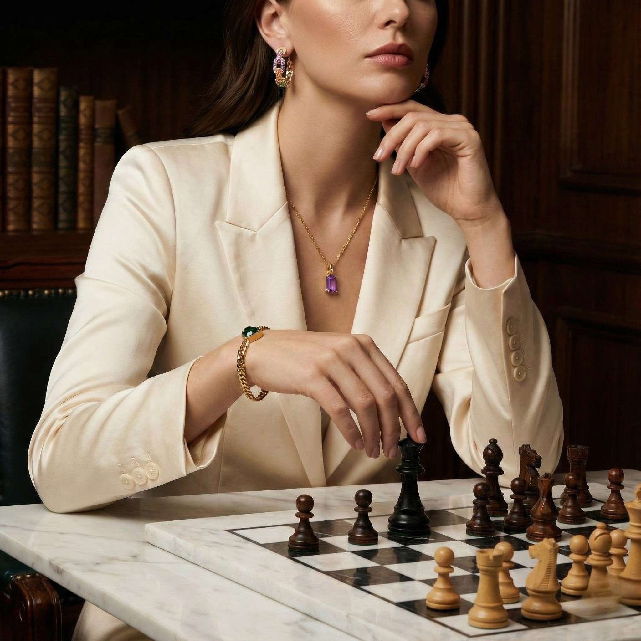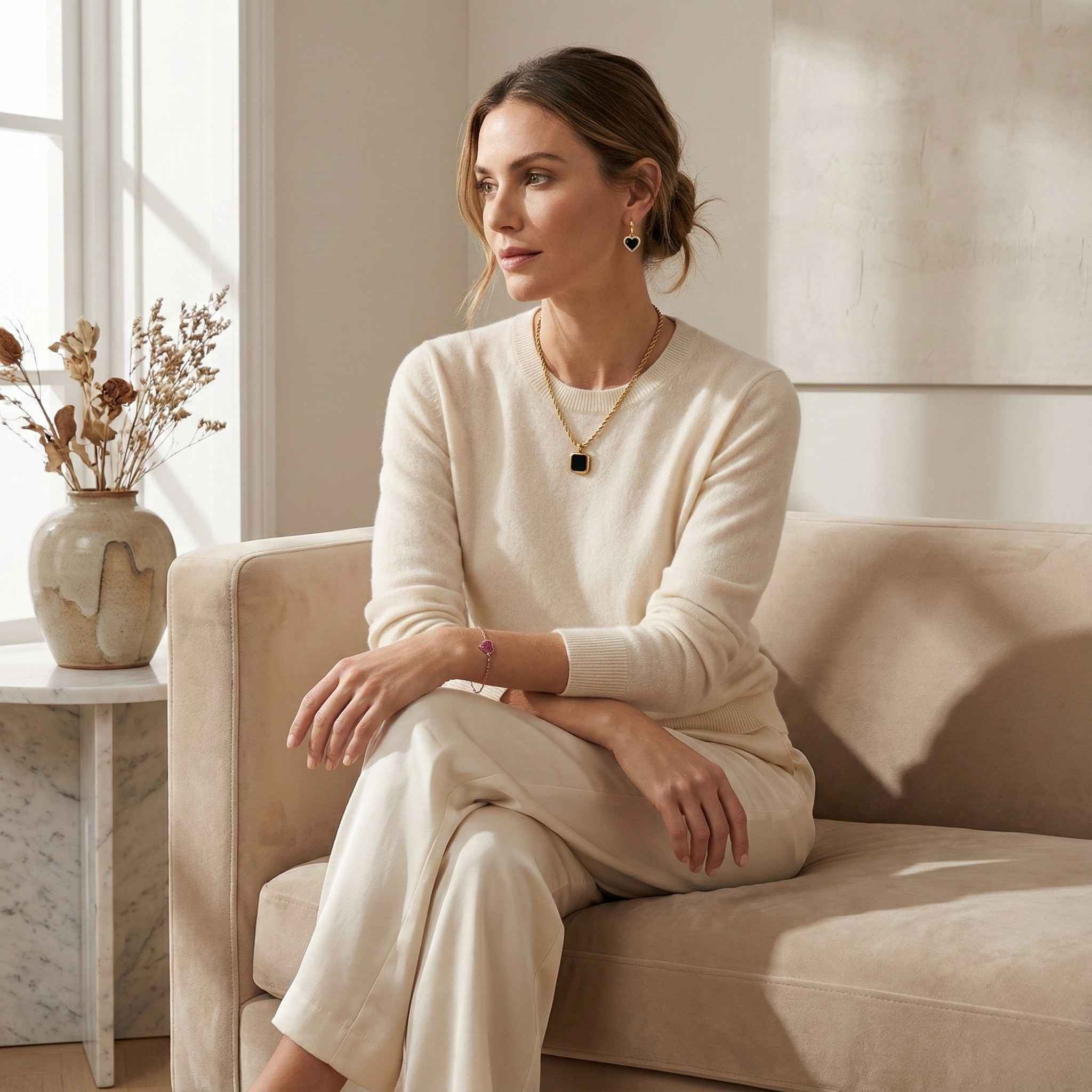A modern, clean look enhanced by delicate jewelry pieces designed to complement any outfit. Versatile, refined, and perfect for daily wear.